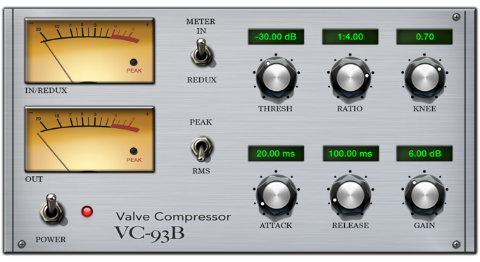 Modeled after coveted tube compressors, VC-93B is a serious compressor for both recording and live use. A well-rounded feature set includes adjustable threshold, ratio, attack, release and output gain. In addition, VC-93B has settable knee and ability to select between peak or RMS amplitude tracking. Analog-style VU meters allow you to monitor your I/O levels or dB reduction in real time, and they both come with peak indicators. Its warm, virtual-analog compression effect is perfect with any instrument or for mastering duties.