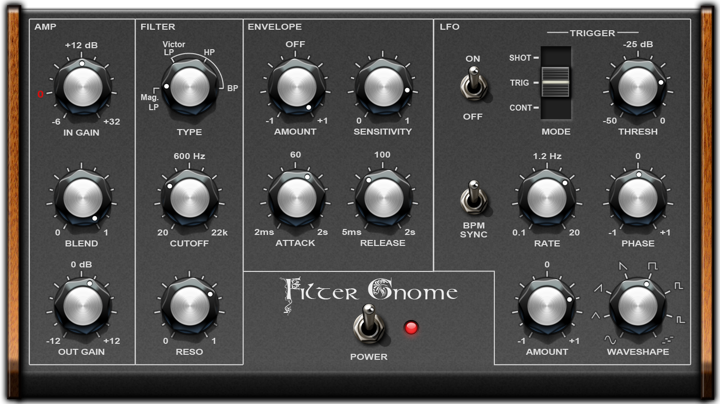 Our most powerful filter unit to date, the 'Gnome' features newly tuned versions of our famed, analog modeling Magellan and Victor filters. The resulting tone is unique; reminiscent of the ladder filter designs found in some of the most famous analog synthesizers built in the '70s. The feature set is very inclusive, allowing you enormous degree of freedom and tweakability. Features include a special saturable input pre-gain stage you can control via the 'In Gain' knob, four types of filters including two lowpasses, as well as a band and a highpass, settable cutoff and resonance, integrated envelope follower with settable amount, sensitivity, attack and release, and a sophisticated LFO with a built-in trigger detector. The LFO has three operation modes - one-shot, continuous and trigger. You can set the trigger threshold to match the strength of your signal or playing style. It also features 8 wave shapes, as well as settable phase and amount and is also BPM syncable with 15 note values.