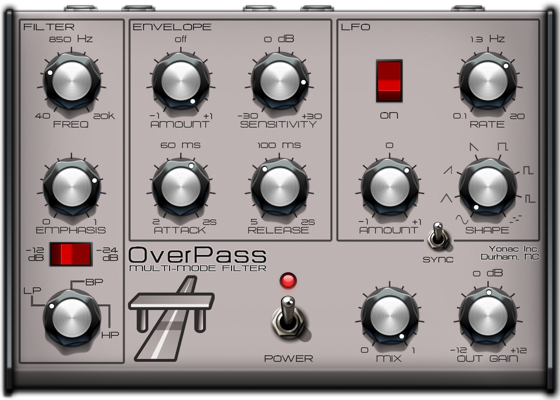 Featuring three different custom-designed virtual analog filters in one unit, the OverPass is a powerful effect to have in any modern rig. With a built-in envelope follower as well as BPM-syncable LFO with eight waveshapes, OverPass leaves the field wide open for experimentation. On the guitar or bass, you can easily obtain a classic synth sound or add a new dimension to your tone. Features include selectable low, high and bandpass filters, filter cutoff and emphasis, settable envelope amount, sensitivity, attack and release, effect blend, and the aforementioned powerful LFO.