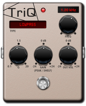 TriQ is a complete filtering and EQing tool with 9 different types of filters packed into a single unit. Choose among: lowpass, highpass, bandpass 1, bandpass 2, allpass, notch, peak, low-shelf or high-shelf filters, all of it the result of our decade-long history and expertise in filter design and implementation. The filter frequency and 'Q' factor are all settable, as well as the output gain. Peak and Shelving filters have settable gain.