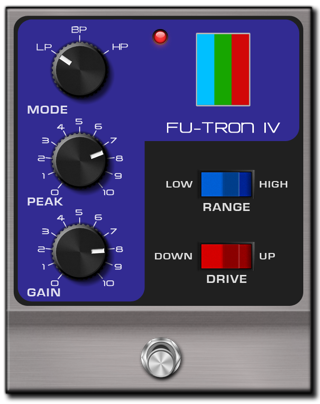 The Fu-Tron IV is the envelope filter that defined funk in the 1970s. Owing its start to early experimentation with synth filters, the Fu-Tron IV features a three-mode analog filter design that shaped as well as sweetened the tone like no other envelope filter or autowah since. Thanks to its Low/High range selector, the Fu-Tron IV is equally as sweet with guitar as it is with bass. The Mode knob lets you choose among lowpass, bandpass and highpass filters to dramatically different effect. The Peak knob lets you dial in the emphasis of the filtering effect. The gain knob specifies the sensitivity of the built-in envelope follower (which you can additionally manipulate by your playing dynamics or instrument volume knob), whereas the Drive switch lets you specify the sweep direction upon note attack.