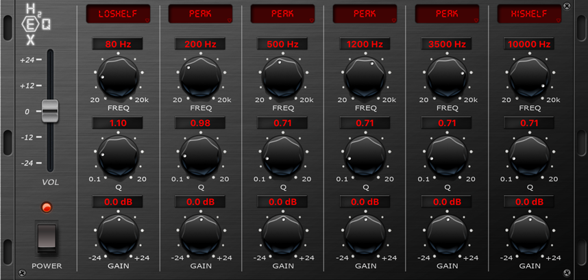 HexEQ2 is a very powerful, fully-parametric, 6-band equalizer/filter with stereo processing. To gain almost complete control over tone shaping, you can assign each band one of 9 unique active-style filters: lowpass, highpass, bandpass 1, bandpass 2, allpass, notch, peak, lowshelf, and highself. In addition, each band includes fully adjustable frequency and 'Q' parameters. Peaking and shelving filters feature -/+ 24 dB of gain.