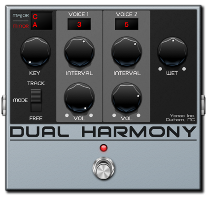 Dual Harmony is a two-voice harmonizer with individually adjustable intervals for each voice. Select the musical key for your performance, and Dual Harmony will replicate your playing in the intervals you specify so you get an instant 3-part harmony effect. The volume of each voice is settable, and the effect also features a tracking-off mode for static accompaniment, as well as a master wet setting for on-the-fly adjustment. Perfect for playing two- or three-part harmonized solos, or for adding dimension to your playing in general - and you can also use it on your vocals!