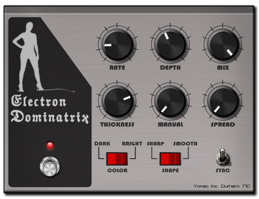 Whip those electrons into shape! Now! Electron Dominatrix features an unbelievably thick STEREO flanging effect coupled with features that will make even the most seasoned FX nut happy. Specify the stereo image with the spread knob. Choose between two different sweep 'shapes'. Select between dark and bright tonality. If you'd like to get creative, turn off the auto sweep and twist the Manual knob to make your own flanging sweeps -- or use the Dominatrix as a static filter. AND the Manual knob also functions as a 'color' parameter when the auto sweep is turned on. We packed a lot into those six knobs, Severin.
