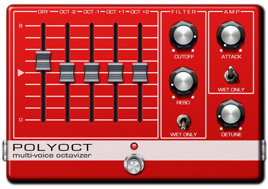One of our crowning achievements, PolyOct is a whopping 4-voice polyphonic octave generator that takes your original signal and replicates it one and two octaves below, as well as one and two octaves above. The result is a sonic assault so thick that you can cut it with a knife. You can mix in each voice individually thanks to dedicated faders. The built-in filter gives you control over the output tone and also has a resonance control. An envelope follower with settable attack lets you navigate between a sharp, sudden attack to a softer, gradual rise similar to a pipe organ. The Detune control very slightly alters the pitch of each voice to give a natural unison effect. In addition, the filter and envelope follower each have dedicated switches so you can attach them to the total signal or just the wet part. Whether your goal is to obtain a tone thicker-than-thou, or get organ sounds out of your guitar (hint: combine it with our RotaryBox rotary speaker emulator), PolyOct is a massive powerhouse in your FX arsenal.