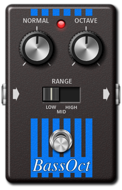BassOct is a high-fidelity octaving effect specially designed for the bass guitar. BassOct lets you obtain 8-string bass tones, as well as extra and extra-extra bottom at the flick of a simple switch. Features include a Range selector for choosing among -2, -1 and +1 octave accompaniment, as well as dedicated dry and octave signal mix knobs.