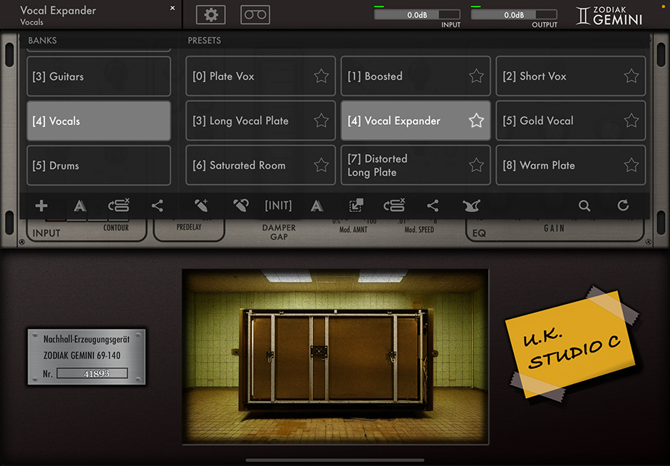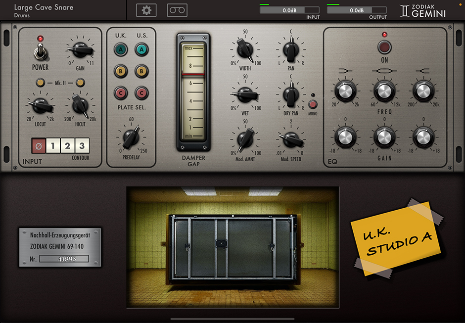 Capture the lush, blooming tones of the legendary plate reverb! We harnessed the latest sound modeling technology to recreate the sounds of six unique plate reverb units used in famous recording studios. These units lent their rich, highly diffused sound to countless classic songs from late 1950s to this day. Now with Zodiak Gemini, these unmistakable reverb tones are yours to reawaken.