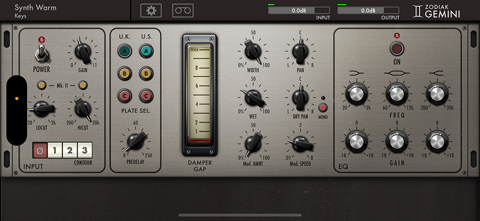 Reverb length is controlled via a modeled mechanical "Damper Gap" parameter. In addition to variable pre delay, stereo width and pan, Zodiak Gemini features special modulation parameters to further tune the reverberation characteristics. At subtle levels, modulation can be used to add an organic quality to the diffusion. At more exaggerated settings, reverb modulation becomes a unique effect on its own, adding chorus or vibrato flavor to the plate output that can be combined with the original signal for sound reinforcement or other interesting results.