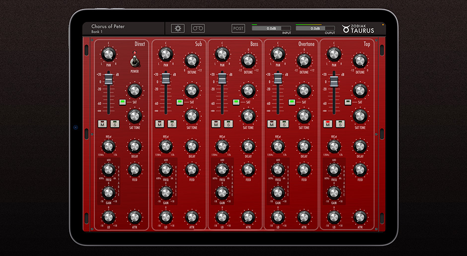 Each Taurus voice features its very own saturation stage (tuned specifically for it); a detune control for obtaining non-octave intervals or even natural chorus or ADT effects; a regenerative delay stage that can be used for staggering the voices, changing their timbre, or even causing them to self oscillate; an attack envelope that can have each voice fade in at different rates; a tuned EQ submodule, as well as stereo panning and other parameters -- all collected in a familiar mixer-like interface.