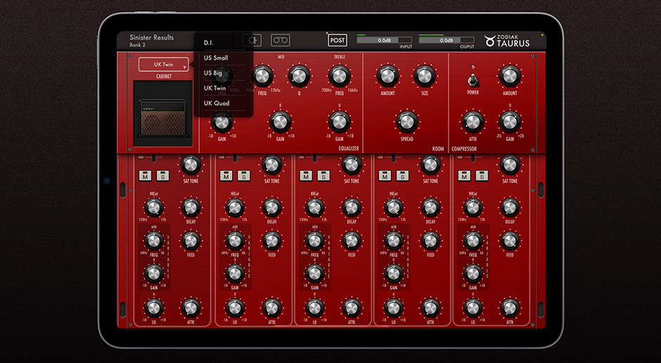 Newly developed algorithms deliver crystal clear signal reconstruction, and operate so efficiently that Taurus is as responsive when playing live as it is well-behaved in the studio. A special post-FX module includes cabinet simulators, room emulation, variable EQ, and compression to produce an easy to use, all-in-one audio solution.